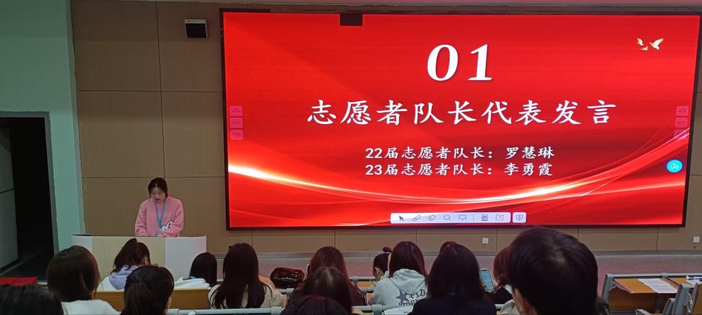 会议开始,由22届志愿者队长罗慧琳和23届志愿者队长李勇霞对志愿服务活动做总结。 随后由新生志愿者代表李欣如上台发言,充分展现出当代青年志愿者的风采和积极向上的精神。紧接着由新生崔茂芬带领大家一起宣读志愿者誓言,激励大家投身于志愿服务中。接下来,由前任部长李荣做部门活动总结,观看志愿活动视频集锦,新任部长郑小娟对部门做未来展望。