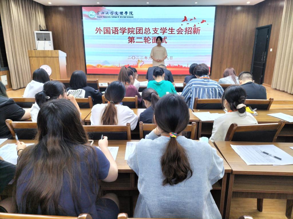 (通讯员 杨吉)9月29日晚六点半,外国语学院团总支学生会于三教408举行第二轮招新面试。外国语学院党总支副书记刘鋆锋,辅导员雷昕、钟燚、王聪聪以及学生会全体成员参加。
