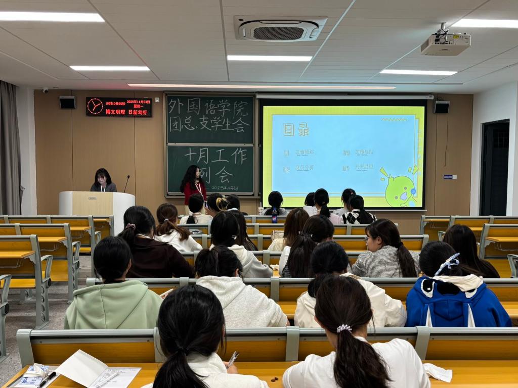 本网讯(通讯员 张跃骞)11月3日晚七点,外国语学院团总支学生会于01-A-308顺利召开十月工作例会。本次例会由学生会全体成员共同参与。本次会议旨在复盘上月工作成果、梳理现存问题,并明确下月工作方向,助力学生会工作提质增效。
