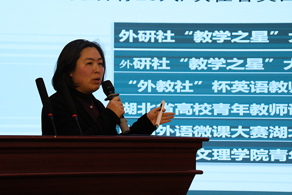许晓艳介绍我院英语专业、商务英语专业作为湖北省一流本科专业建设点的情况,强调同学们在选择专业时要避免从众心理,明确个人优势,考虑就业市场容纳度,以及未来可持续发展空间。