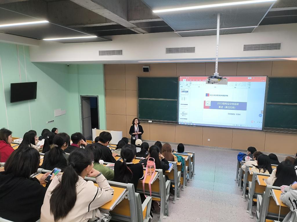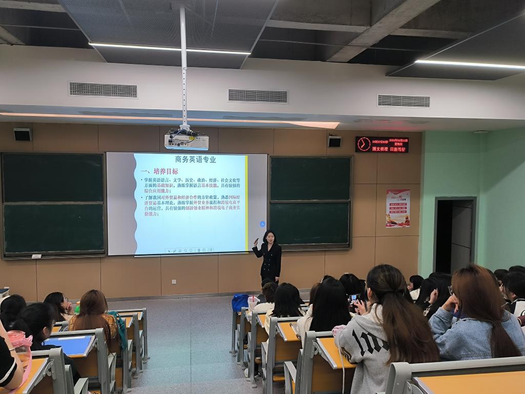 随后,商务英语教研室主任李琳老师针对商务英语专业进行了深入剖析。她结合当前国际贸易的发展趋势和潜力,分析了商务英语专业的就业前景和市场需求。李老师还通过实例展示了商务英语专业学生在实际工作中的优秀表现,使学生们对商务英语专业有了更加直观和深入的了解。