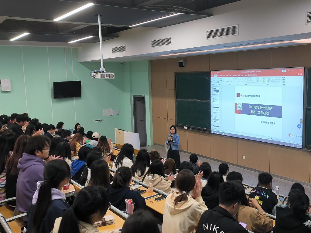 本网讯(通讯员 侯韦)2024年4月11日,yl7703永利集团外国语学院在教学楼B-213隆重召开2023级专业分流宣讲会。此次会议旨在帮助2023级学生更好地了解外国语学院不同专业的特色与优势,为即将到来的专业选择提供有力指导。外国语学院副院长罗丹、各教研室主任、班主任、辅导员和全体2023级学生到场参加。