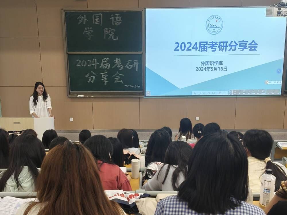 本网讯(通讯员 钟燚)5月16日下午两点,外国语学院在教学楼B-213举办了一场别开生面的考研分享会。此次活动旨在为2025届学生提供宝贵的考研经验和指导,由罗丹院长主持开场,并邀请了2024届成功考研毕业生作为主讲嘉宾。