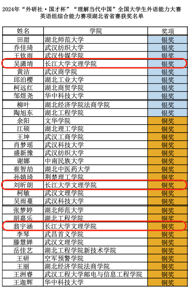 本网讯 近日,2024“外研社·国才杯”“理解当代中国”全国大学生外语能力大赛英语组综合能力赛项湖北省省赛获奖名单新鲜出炉。我院学生英师5231班吴潇堉获银奖,商务5221班刘昕朗以及商务5231班翁宇涵均获铜奖,英师5222班胡荣、英日5221班胡文馨以及商务S5241班赵书华获优胜奖。本次参赛选手的指导教师为罗丹和许娴静。