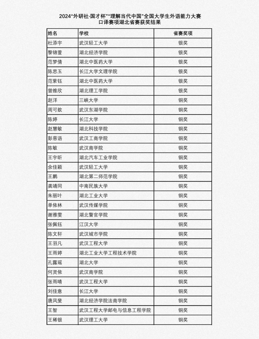 我院学子2024年“外研社·国才杯”“理解当代中国”全国大学生外语能力大赛英语口译组湖北省赛中荣获银奖