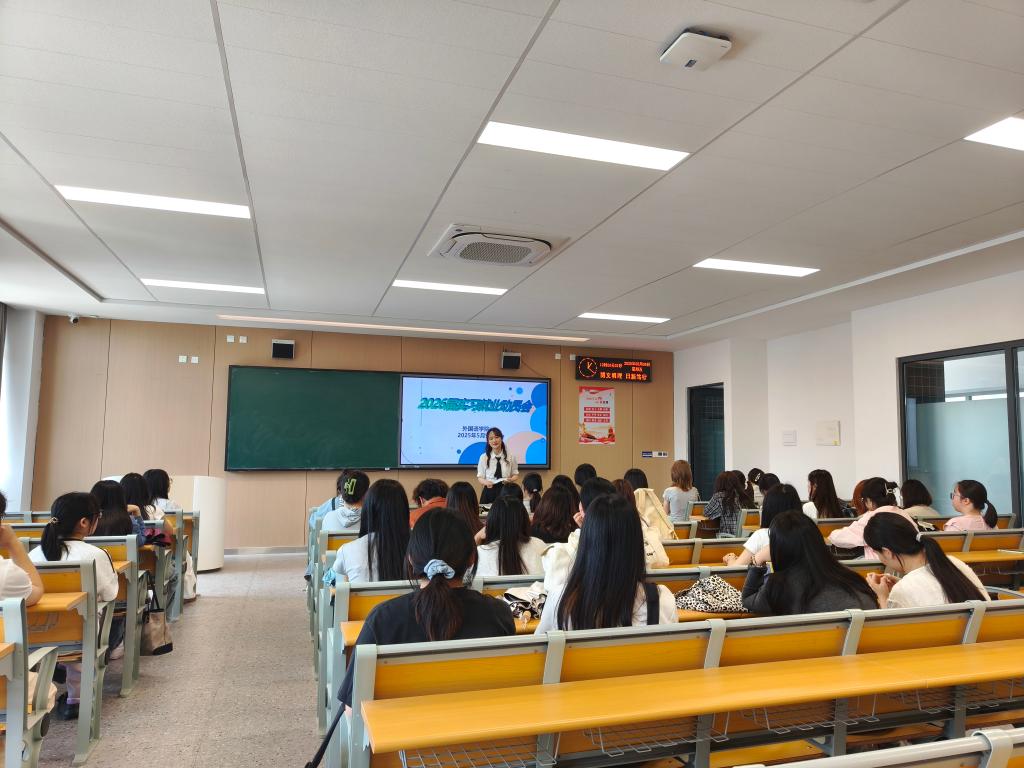 本网讯(通讯员 许静婷)5月9日,外国语学院2026届毕业生实习就业动员会在教学楼A408教室举行。外国语学院党总支书记王玲玲、辅导员许静婷及22级英语师范专业学生参加会议。