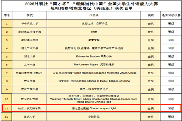 本网讯 近日,在纳入《全国普通高校大学生竞赛分析报告》竞赛目录的权威赛事中,我校外国语学院学子凭借扎根荆楚文化的创新创作与扎实的跨文化传播能力脱颖而出,连获多项省级重要奖项,其中2项作品将代表湖北晋级国赛。