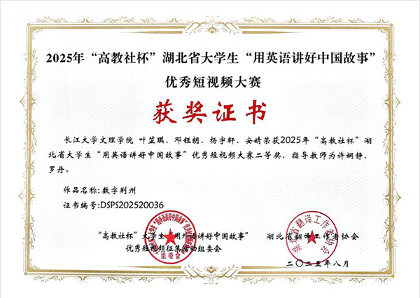 此次获奖作品紧扣“用英语讲好中国故事”核心,立足荆楚文化根基与时代发展视角,构建起特色鲜明的楚文化传播矩阵。在第八届“外教社杯”全国高校学生跨文化能力大赛“讲述中国传播中国”短视频大赛中,作品《漆语千年・楚韵流光》聚焦楚文化漆器魅力,获省级特等奖;2025“外研社•国才杯”“理解当代中国”全国大学生外语能力大赛短视频赛项中,作品《漆光里的荆楚》深挖漆器背后的文化内涵,摘得省级金奖;2025年“高教社杯”“用英语讲好中国故事”短视频大赛上,作品《数字荆州》则以现代视角展现城市活力,获省级二等奖。