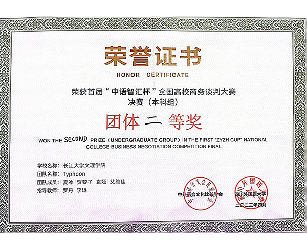 本网讯(记者 刘磊)近日,从首届“中语智汇杯”全国高校商务谈判大赛总决赛赛场传来佳讯:我校外国语学院商务英语专业2020级学生夏冰、贺黎子、袁娅、艾维佳组成的“Typhoon”谈判团队获本科组二等奖。