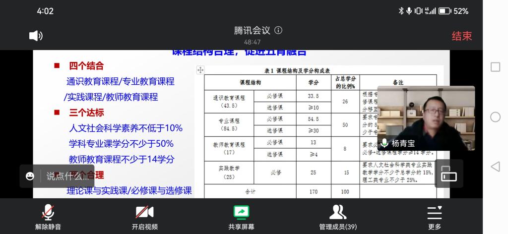 首先,杨青宝副教授解读了师范生培养的理念、体系及标准,强调师范生培养的“主线”和“底线”。 随后结合师范专业人才培养方案和课程教学大纲制定和实施过程,他详细介绍了师范生培养的目标和师范生能力素养的培养路径。最后,他深入剖析了师范专业课程的目标达成度分析及改进方法,并就师范生实践类课程教学、第二课堂活动开展等与教师们进行了互动交流。