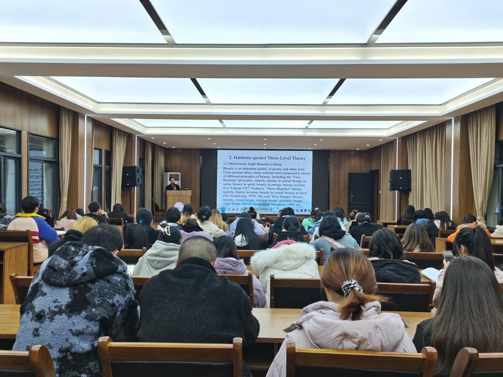 讲座开始,王峰教授由中西方在“诗词”文化上的差异引出综合三层次翻译理论。他提出诗歌翻译中应该强调和谐美的再现。需要在宏观层面上接受“和谐”理论,在微观层面,提出包括形式美、音乐美、形象美、情感美、内涵美、措辞美、典故美和格式塔美的“八美标准”。并现场展示了中外诗词的多模态传播实例。