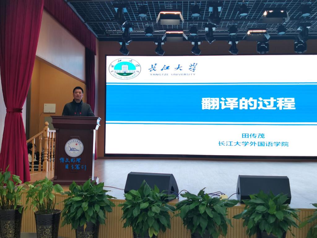 田传茂教授以同学们是否做过翻译相关的工作,是否认为学好英语语言就自然能做好翻译等问题引发学生对于翻译这一概念进行思考。他认为翻译过程分为准备、理解、表达和校对四个阶段。准备阶段,应注重结合写作风格、特点与社会背景;理解阶段,应主要关注词句、段落与篇章理解;表达阶段,应根据具体语境寻求最佳表达;校对阶段的基本流程则分为初校、复校和定稿。