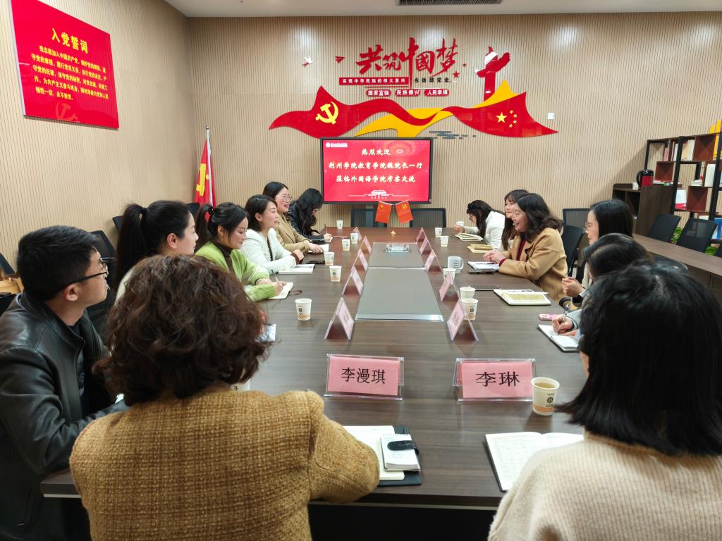 本网讯(通讯员 李培培)3月19日下午,荆州学院教育学院魏院长一行前来外国语学院调研交流,外国语学院院长许晓艳、党总支书记王玲玲,副院长罗丹及各教研室主任参加交流座谈。