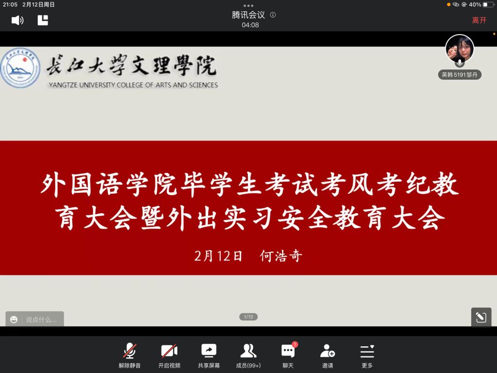 (通讯员 胡世丹)为引导学生扣好新学期“第一粒扣子”,确保学校开学安全有序。2月12日晚七点,外国语学院各年级组织开展“开学安全及考风考纪教育”主题班会,此次班会由各班辅导员主持。
