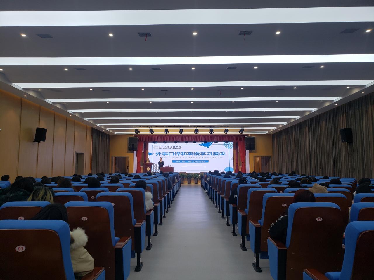 本网讯(通讯员 赵欣雨)12月8日,在城中校区多功能报告厅,外国语学院94级优秀校友殷好以“外事口译和英语学习漫谈”为题开展讲座。外国语学院院长许晓艳和该学院党总支副书记、辅导员及相关专业学生代表近两百人参加讲座。