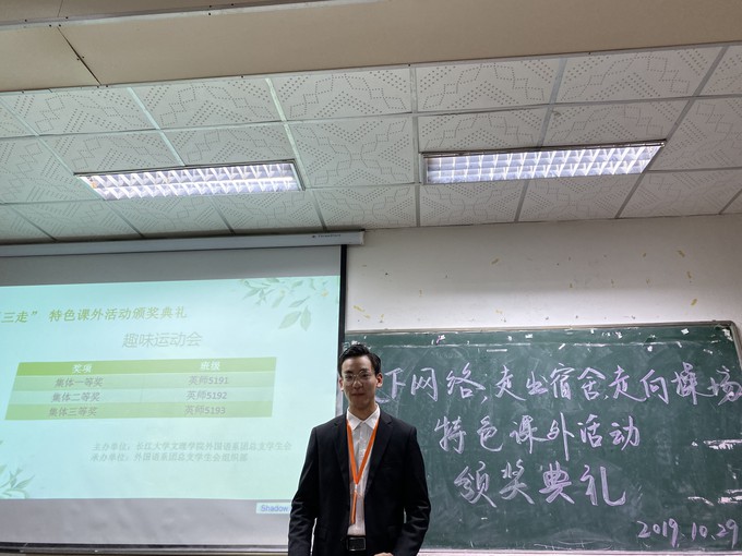 为表彰在“三走”活动中表现出色的同学,10月29日晚七点,外国语系于一教308室举行了“三走”活动颁奖典礼。辅导员拓颖老师出席了本次颁奖典礼。