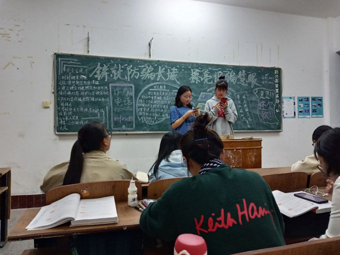 (通讯员见习记者王希千)为加强新生的安全防范意识,切实保护学生人身及财产安全,10月13日晚,各班组织开展“预防诈骗”主题班会活动。班会由各班班委主持。