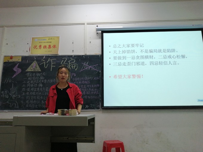 班会上,班委给同学们讲解常见的诈骗手段,分析诈骗案例,真实的案例让同学们对于诈骗的形式和常用手段有了充分的了解,提高了同学们的对于诈骗的认识,从而提高警惕,吸取经验教训。同时也让同学们了解到诈骗随处可见,应学会识别各种骗局,最大限度保护自身权益。互动环节,同学们积极发言,陈述自己身边发生过的诈骗案例,引起了同学们的高度重视。
