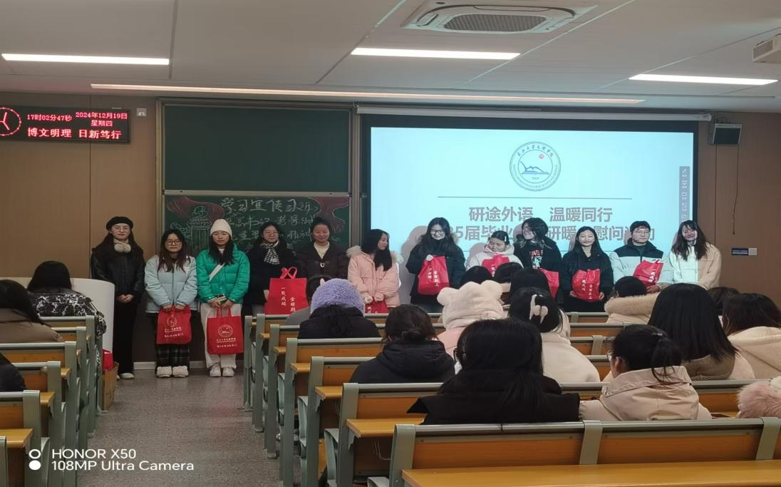 本网讯(通讯员 吴潇堉 钟燚)在考研即将来临之际,为即将踏上考场的考研学子们送去温暖与鼓励,外国语学院于2024年12月19日组织了一场考研暖心慰问活动。本次活动由钟燚老师主持,王玲玲书记出席,全体2025届考研毕业生共同参与。