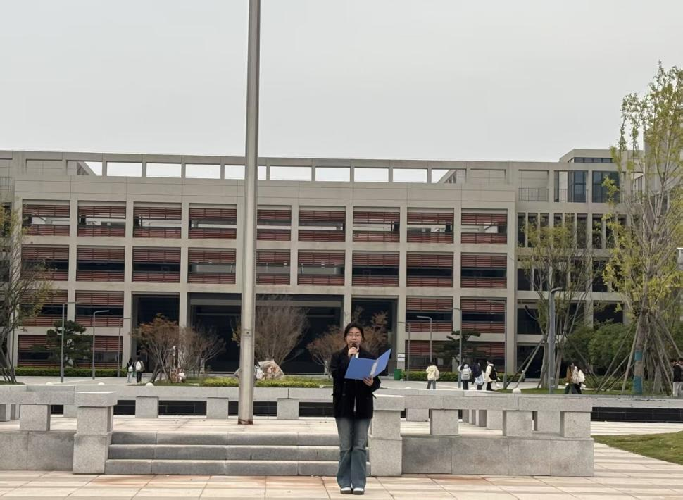 随后,学生代表吴潇堉以《以青春之名,贺祖国华诞》为题发言,结合外语专业特色,阐述青年学子如何以语言为桥讲好中国故事。教师代表许静婷老师以《以青春小我,筑梦时代华章》为题,鼓励同学们把英语从“一门专业”变成“一种能力”。