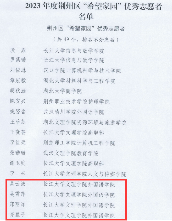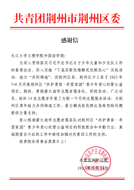 (通讯员 许静婷)近日,我院收到荆州区团委发来的感谢信,对暑假期间荆州区的“共护青苗·希望家园”青少年爱心托管公益项目中,我院薪火助学志愿者服务队的14 名志愿者予以表扬,并授予4名同学荆州区“希望家园”优秀志愿者称号。