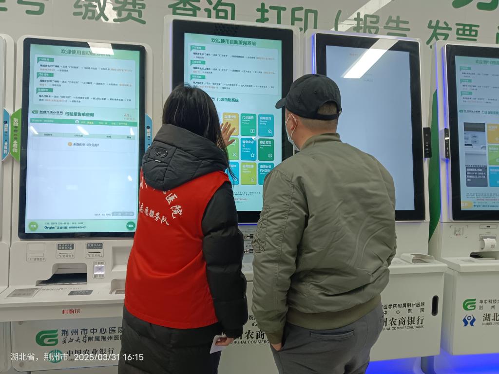 下午 2 点,志愿者分组在医院门诊大厅自助挂号机、分诊台及科室指引处值守。面对就诊高峰,他们主动帮助患者操作挂号系统、打印检查报告,为老年患者提供 “一对一” 引导服务,并耐心解答患者关于科室位置、就诊流程等方面的问题,有效缓解了门诊高峰期的压力。