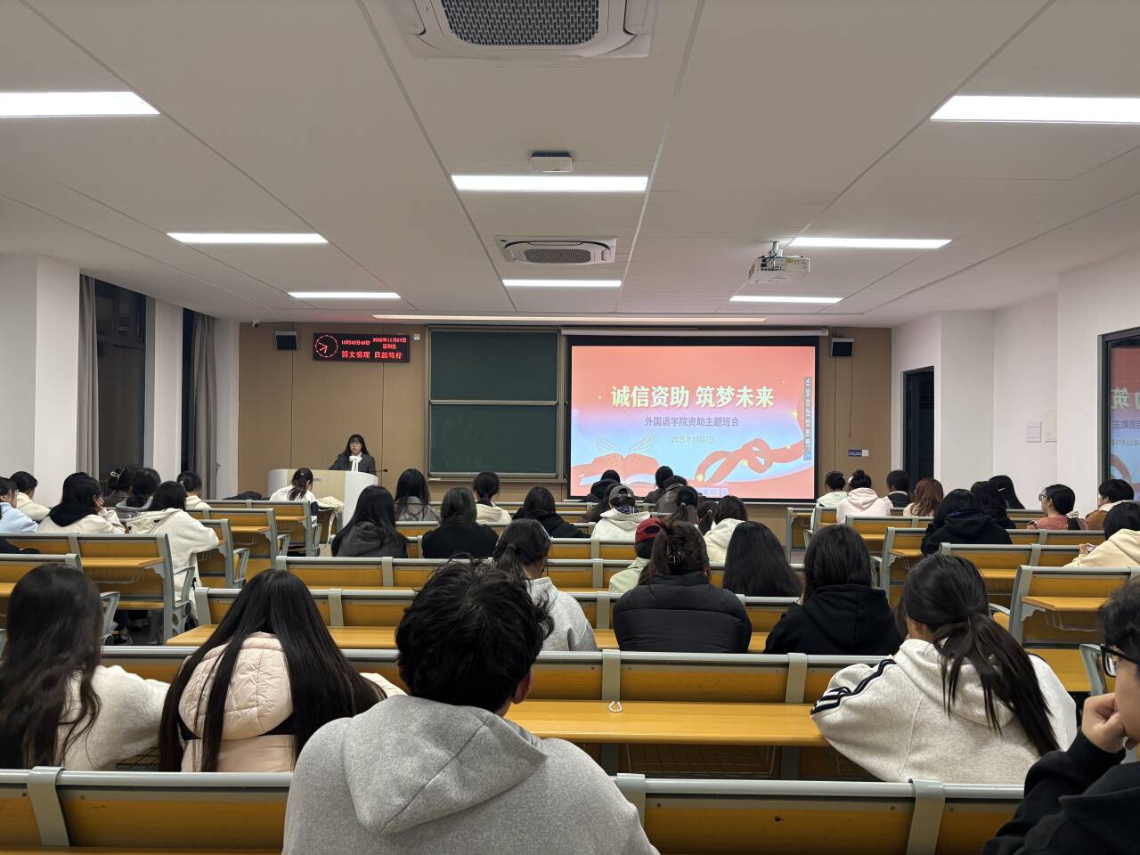 本网讯(通讯员 陈欧迅)为强化受助学生的诚信意识,引导其珍惜资助机会,励志成长,11月7日晚6时40分,外国语学院针对2025年国家励志奖学金、国家助学金获得者,召开“诚信资助 筑梦未来”主题班会。学院全体受助学生、辅导员许静婷、钟燚参会。