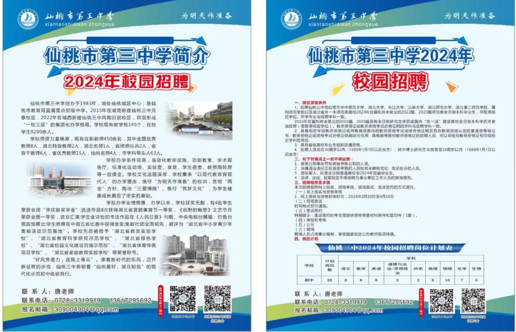 仙桃市第三中学创办于1983年,地处仙桃城区中心,是仙桃市教育局直属重点初级中学。2015年在城南新建仙桃三中元泰校区,2022年在城西新建仙桃三中风和日丽校区,目前形成“一校三区”的集团化办学格局。学校现有教学班145个,在校学生9200余人。