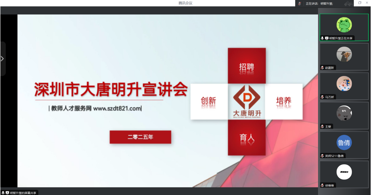本网讯(通讯员 赵晨新)2025年4月14日晚7时,一场聚焦教育实习岗位的线上宣讲会圆满举行。本次宣讲会由外国语学院精心主办,深圳市大唐明升教育集团作为招聘方,为广大怀揣教育梦想的学子带来了高中英语顶岗实习的宝贵机会,吸引了众多学生踊跃参与。