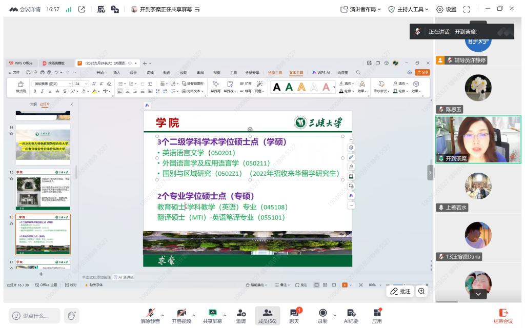 讲座伊始,屈琼教授首先介绍了三峡大学外国语学院基本情况。随后,聚焦英语学科特点,分别对不同专业的招考形势、复习重点等作出细致解读。在备考建议环节,屈教授系统梳理了多个英语专业考研的科目复习方法,包括二外、专业课等的阶段性学习计划,并就考研复试策略进行详细讲解。
