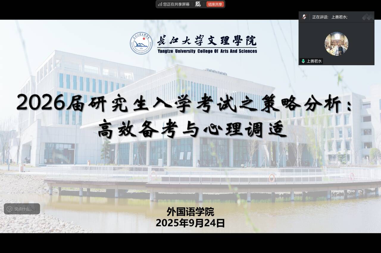 本网讯(通讯员 许静婷)为帮助考研学生明确备考方向、把握英语专业考研动态,2025年9月24日晚,我院特邀三峡大学外国语学院屈琼教授,为2026届考研学生开展了一场题为“研究生入学考试之策略分析:高效备考与心理调适”的专题讲座。讲座由外国语学院许晓艳院长主持,2026届毕业生辅导员许静婷、考研学子参加。