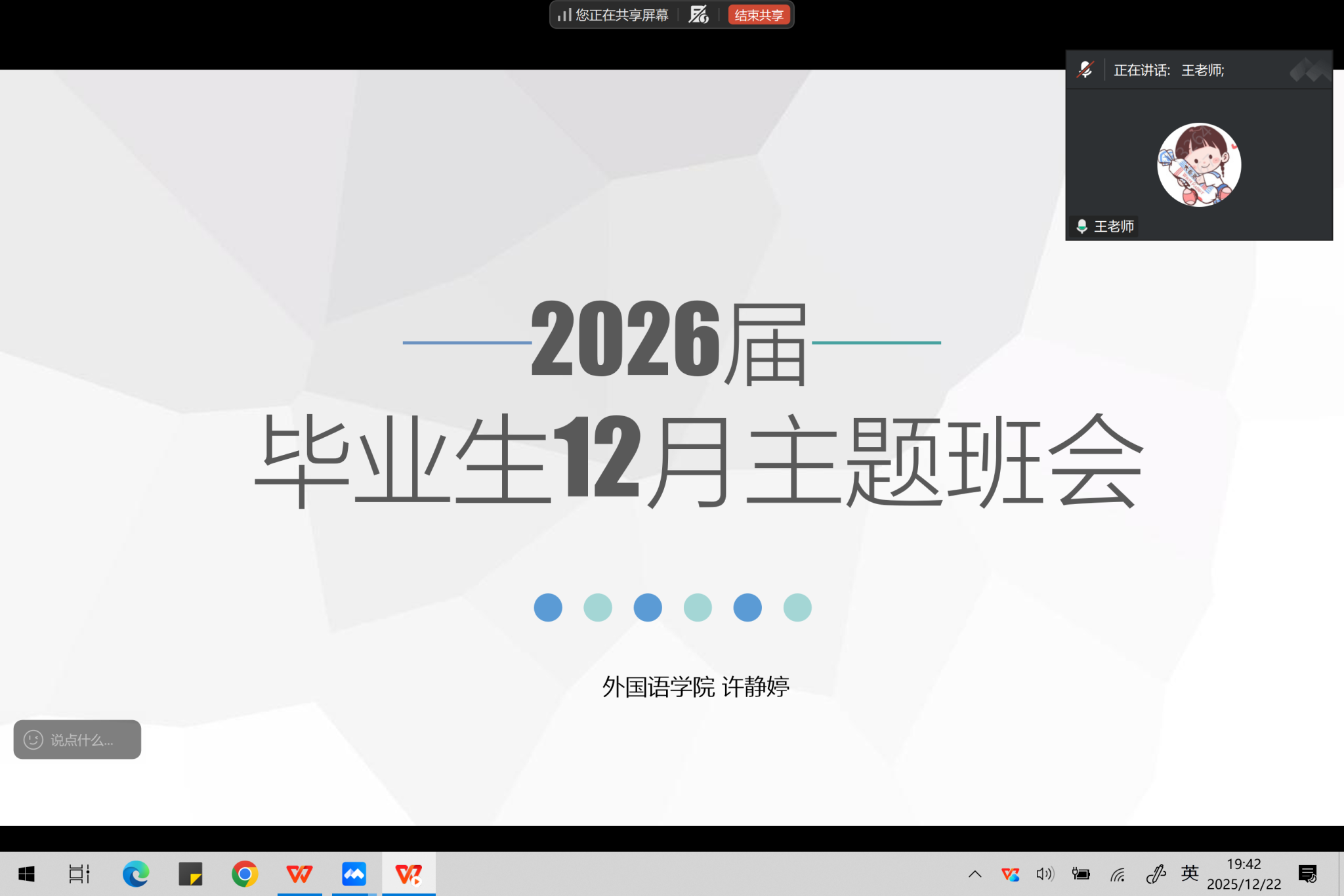 本网讯(通讯员 许静婷)为帮助 2026 届毕业生准确把握当前就业形势,熟悉毕业流程与就业手续,12 月 22 日晚,外国语学院通过腾讯会议线上平台召开了 2026 届毕业生就业指导主题班会。外国语学院党总支书记王玲玲、辅导员许静婷、毕业班班主任们及 2026 届全体毕业生参加了本次会议。