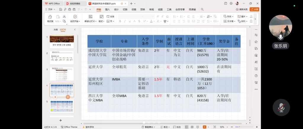 张乐玥老师介绍了英韩双语专业的优势、韩国近些年对于吸引国外人才所采取的优惠政策。详细介绍了申请的准备工作和重要时间节点,分享择校经验及申请奖学金的技巧,为学生提供了更全面、更详实的出国留学指导和建议。