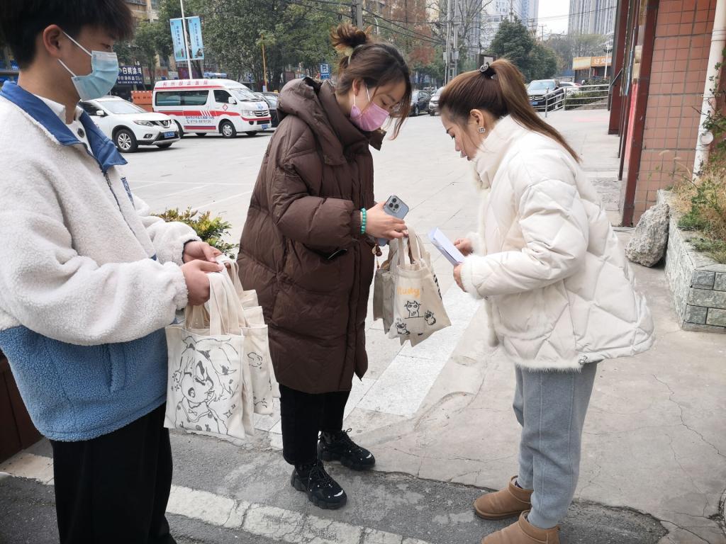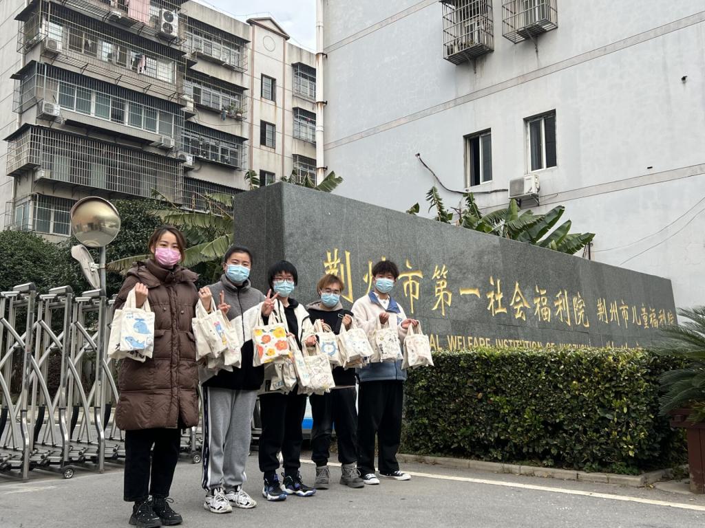 福利院门口,外国语学院师生代表向福利院负责人捐赠亲手绘制的帆布包、写满心灵寄语的明信片、利用劳动教育课义卖所得善款购买的冬日暖心物资。一切美好的祝愿都汇集在这些物资当中,希望他们能够健康成长。