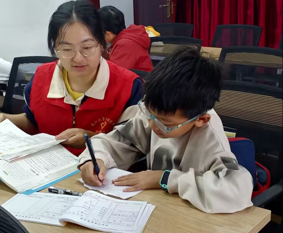 阳光明媚,四周温暖舒适,志愿者伴随着愉悦的心情准时到达支教地点,耐心细致地辅导小朋友们完成作业,小朋友们也积极配合。