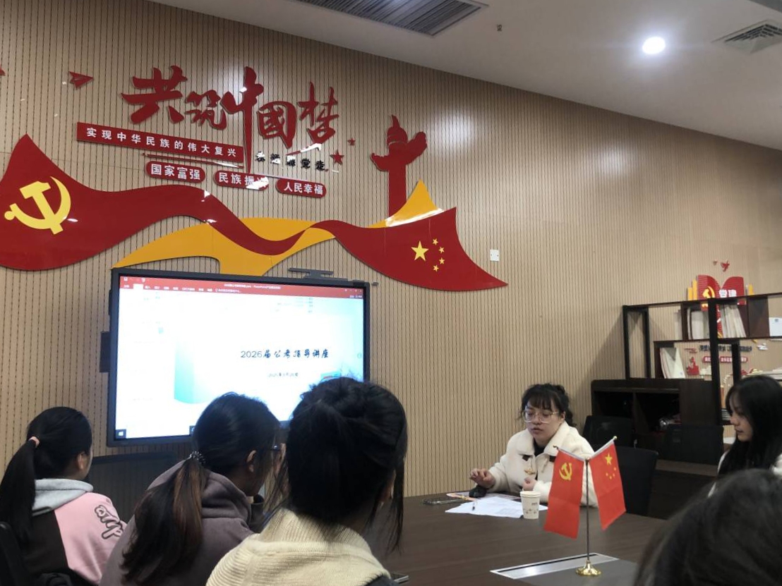 本网讯(通讯员 陈璇)为助力外院学子把握公职类考试最新形势,掌握备考策略,提高备考水平,我院于2025年3月19日19:00在图书馆526室开展2026届公考指导讲座。本次活动由学院辅导员许静婷老师主讲,系统梳理了公职类考试的核心要点。现场互动热烈,干货满满。