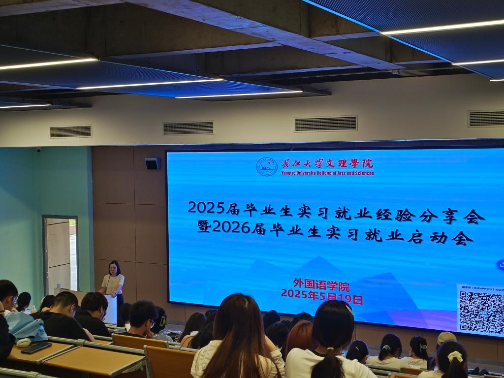 本网讯(通讯员 孟鑫竹)为推动毕业生实现精准就业、高质量就业,树立正确的就业观、择业观,提升就业能力,5月19日下午教学楼B-214,外国语院举办2025届毕业生实习就业经验分享会暨2026届毕业生实习就业启动会。外国语学院副院长罗丹、商务英语教研室主任李琳老师、辅导员许静婷、侯韦,2025届优秀毕业生及2026届毕业生近150人到场参加。
