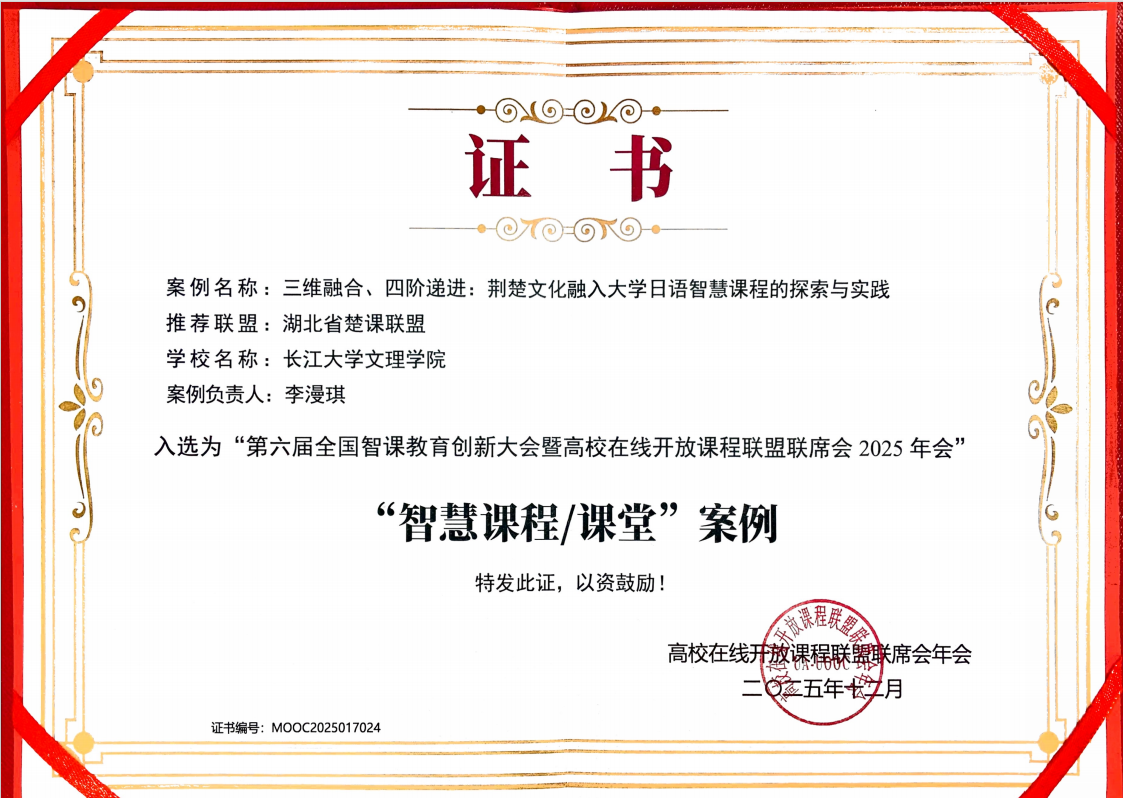 本次大会同期开展优秀课程案例遴选,经楚课联盟前期推荐、全国大会专家评审,湖北省共17所高校的25个案例脱颖而出。李漫琪主持的《大学日语》依托超星智慧教学平台重构课程内容,打造“荆楚文化+智慧日语”的个性化路径:以“荆楚文化对日传播”为主线,构建“日语知识—文化传播—思政育人”三图谱融合的数字化内容体系,通过智慧工具实现个性化学习路径,形成“感知・理解・表达・传播”四阶递进育人生态,推动学生从“沉默学习者”转变为“文化传播者”。
