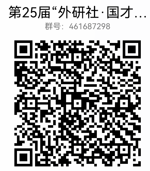 请参赛选手加入英语辩论赛比赛群QQ:461687298,以关注后续通知,参赛选手自由完成两人一组的组队,并扫描下方二维码进入参赛群。