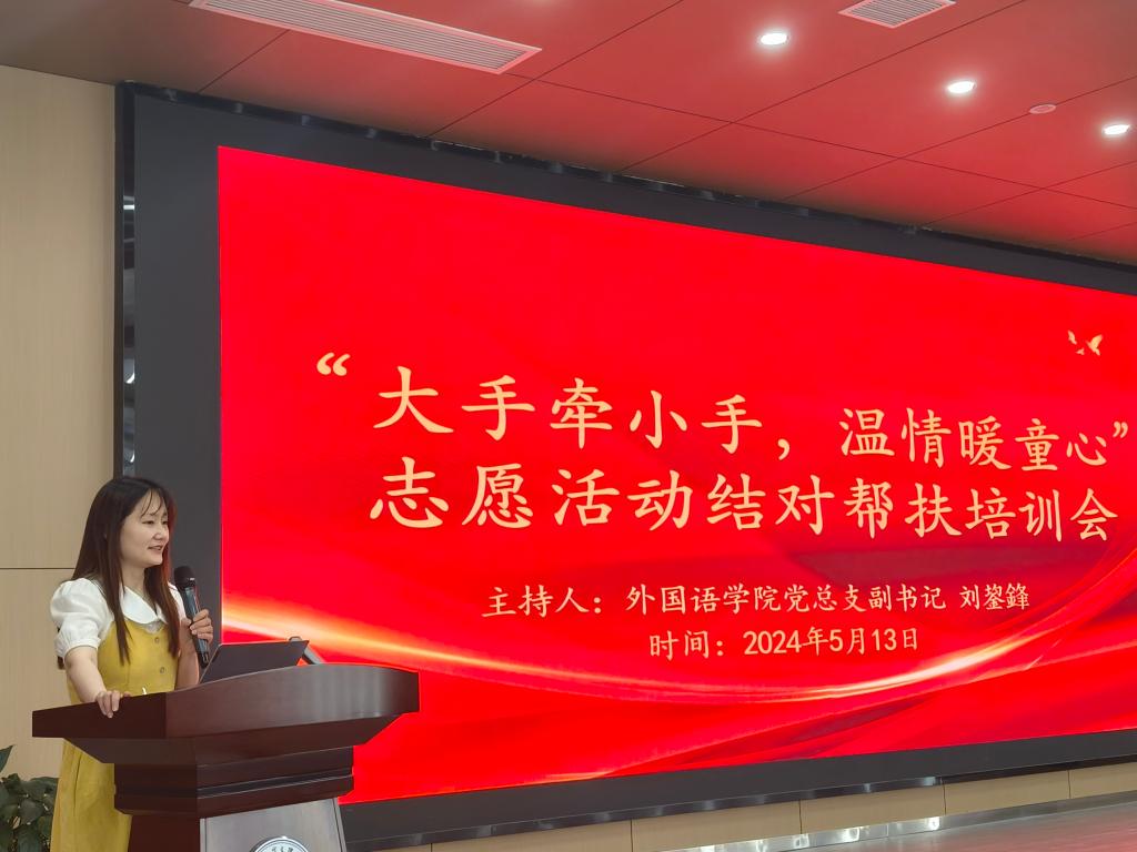 本网讯(通讯员 杨飞燕)5月13日,外国语学院展开了“大手牵小手,温情暖童心”志愿活动结对帮扶培训会。会议由外国语学院党总支副书记刘鋆锋主持。