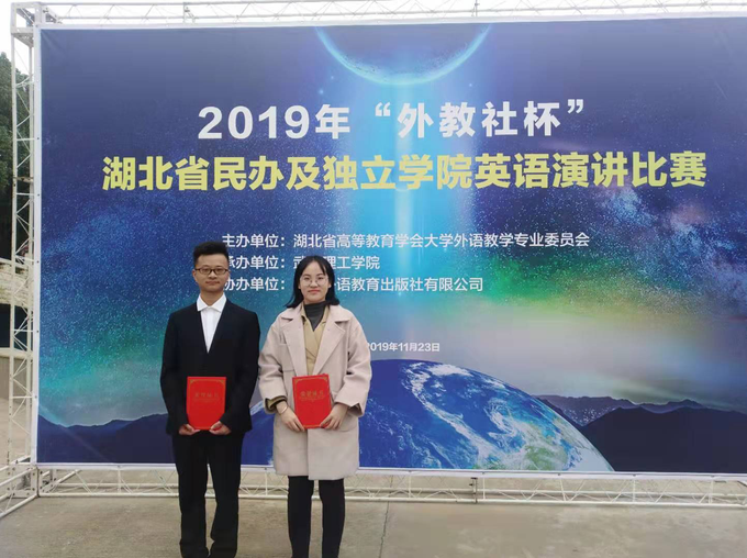 2019年11月23日,2019年“外教社杯”湖北省民办及独立院校英语演讲比赛在武昌理工学院举办。我院外语系英语师范5182班戴珺妍同学,人文与传媒系编导5181班王子豪同学分别荣获三等奖。