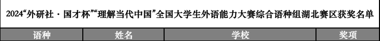 本网讯(通讯员 严娟娟)2024年10月19日,2024“外研社·国才杯”“理解当代中国”全国大学生外语能力大赛多语种组省赛顺利举办。来自全国近600所高校的3393名多语种选手在线上完成了比赛,语种涵盖俄语、德语、法语、西班牙语、阿拉伯语、日语、意大利语、葡萄牙语、韩国语。大赛赛题以“理解中国,沟通世界”为主题,引导选手深入领会习近平新时代中国特色社会主义思想的核心要义,理解中国之路、中国之治、中国之理,涵养家国情怀、全球视野,拓展知识广度、思想深度,展现外语能力、跨文化能力、思辨能力、创新能力等综合素养。多语种组省赛由定题演讲和综合试卷两部分组成,综合试卷包括阅读客观题、汉外笔译和写作。湖北赛区由湖北省教育厅联合中共湖北省委外事工作委员会办公室、湖北省社会科学界联合会共同主办。我院学生英日5221柳琪、夏雨彤、胡泉分别荣获省赛日语组银奖、铜奖、优胜奖。英韩5211朱金格、崔丹丹荣获省赛韩语组优胜奖。