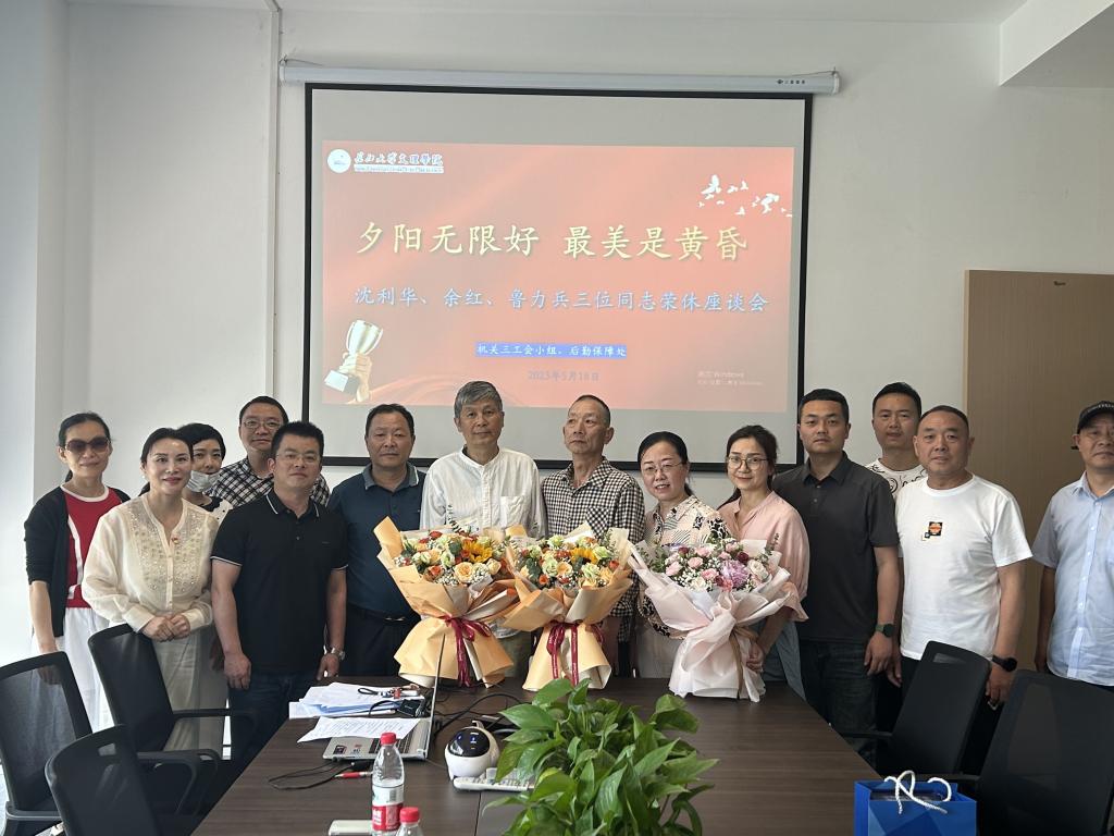 本网讯 5月18日下午,机关三工会小组、后勤保障处为即将退休的余红、沈利华、鲁力兵三位职工举办荣休座谈会。院长助理郭明虎、工会主席刘磊、机关三工会小组代表及后勤保障处全体教职工参加,座谈会由机关三支部书记曲莉主持。