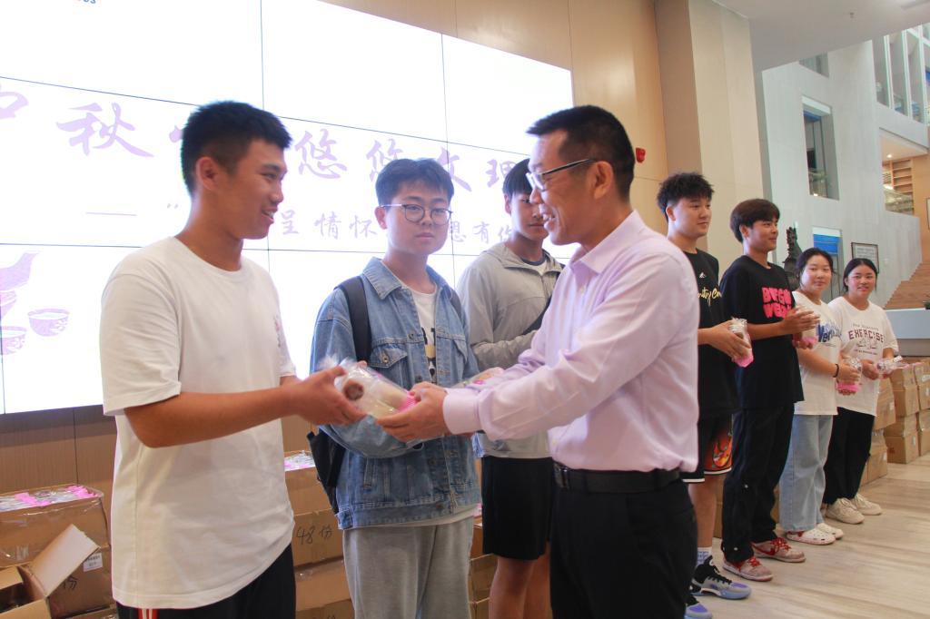9月27日,学院党委书记颜建洲,学生工作部部长李刚英,院系党总支副书记及辅导员为2023级新生送上节日祝福和月饼。