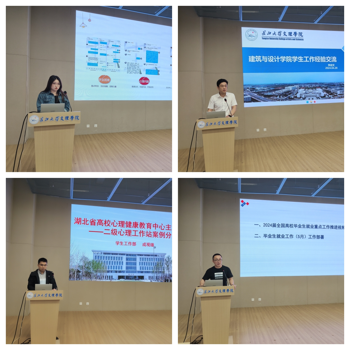 会上,信息与机电工程学院辅导员燕梦蝶以《关爱学生 从心出发》为题,总结了四年辅导员工作中的心得体会,分享了做好育人管理工作的三个“锦囊”:第一,做实做细日常管理,守好安全底线;第二,用心用情帮助学生解疑答惑,帮助特殊困难学生;第三,亲力亲为做好学生价值引领,筑牢思想防线。建筑与设计学院党总支副书记李启文结合自己近20年的学生工作经历,对辅导员在工作中的素质要求、思想态度、工作方法、纪律意识等方面,给出了指导性的措施和意见,助力辅导员老师们在工作中,不断发挥自己的主观能动性和创造性,夯实工作的实效性。学生工作部副部长成观雄就湖北省高校心理健康教育中心主任培训的重点内容,与学工队伍进行了交流。他阐述了三所不同高校“二级心理工作站”的优秀典型案例,并结合我校工作实际,对院系心理健康教育工作的质量提升总结了策略。