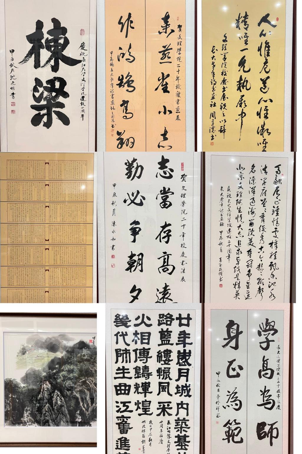 “栋梁”是第一任学院院长沈光明的题字,题字浑厚雄伟,笔锋的筋骨之力仿佛寄语学院在未来发展中将为国家培养出更多国之栋梁;孟修祥教授题字“学高为师 身正为范”旨在告诫我校教师们不仅要有扎实的专业知识和广博的科学文化知识,还要为人师表,做学生的榜样;“马融居正终情处,慞桂飘香池水清;学府堂堂育俊秀,杰出赫赫显声名;漂洋过海留欧美,夺冠争金进北京,文理师生怀大志,追求卓越是精英。”王家政教授的题字饱含深情,带领师生们追溯了学校的发展历史,也生动诠释了未来学校要前进的方向。王国清、周运浓、谭伟、郝芳、余伊曼、陈永和、李继祥等专家老师们均纷纷呈墨献宝,字里行间表达了对学校高质量发展的殷切期盼,一撇一捺凝聚着对同学们成人成才的深深祝福。