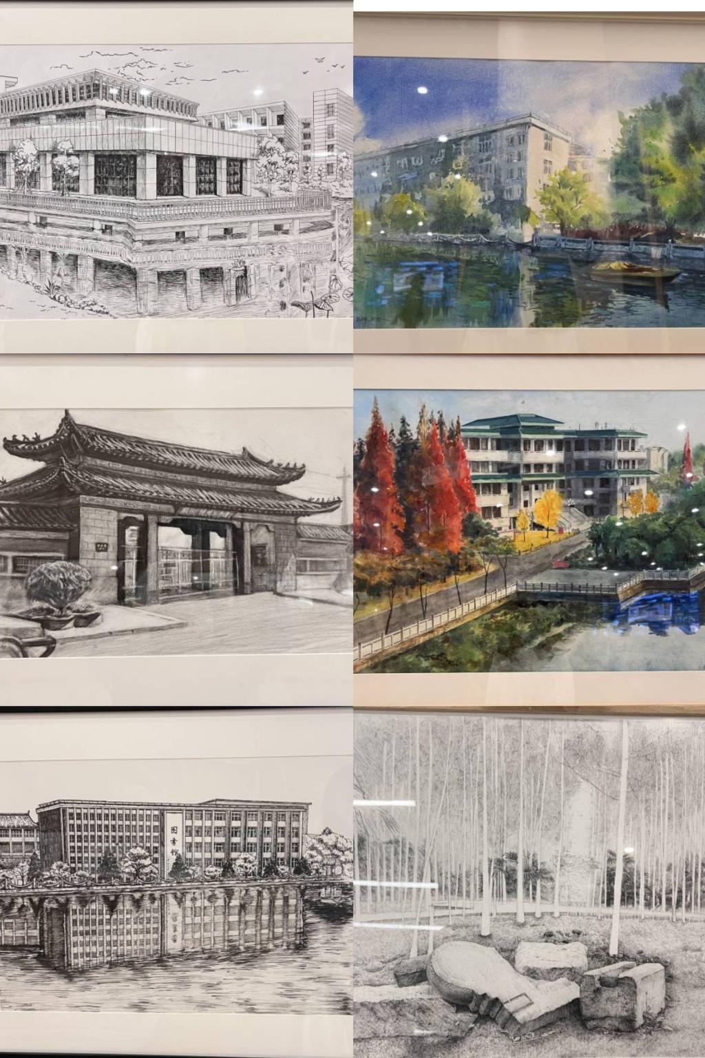 “这是老校区大门、图书馆和满墙的爬山虎、泮池水韵、朗诵亭的石磨石……”观展的校友们看到展出的画作惊呼。粉画《风采》、《疆域》等带领大家领略了我校办学20年来昂扬向上的精神风貌和锐意进取的家国情怀。一幅幅画作从独特的视角,以艺术的语言,展现校园旖旎风光,勾勒学院变迁,记录学院发展历程,传递着对美好未来的无限憧憬。每一幅作品,以笔墨为媒,以色彩为桥,以深情为伴,将学院的历史与现实紧密相连,表达着对学院各项事业的认知和理解,诠释着学院深厚的文化底蕴,彰显了学院的办学特色,倾诉了创作者对学院的情感,给观者呈现了一堂生动的思政课。