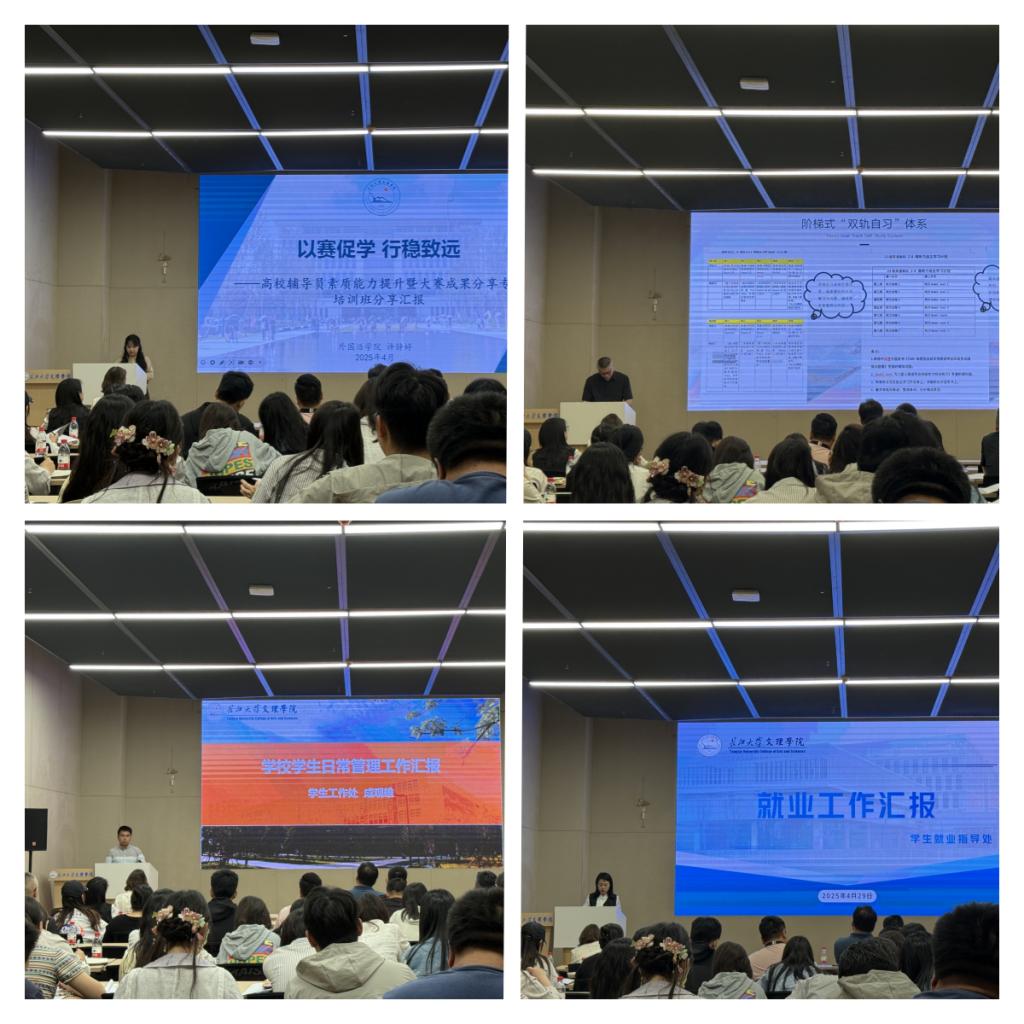 会上,外国语学院辅导员许静婷以《以赛促学 行稳致远》为题目,分享了参加“高校辅导员素质能力提升暨大赛成果分享专题培训班课程”的心得与体会;外国语学院党总支副书记刘鋆锋从四个方面以《双驱双控 特色育人——深化“双驱双控”育人体系构建学业成长精准生态》为主题做特色工作分享;学生工作处副处长成观雄分别从管理工作规范、目前存在问题、后期工作安排进行了学生日常管理工作汇报;学生就业指导处副处长郭珍珍对近期工作进行了汇报和部署。