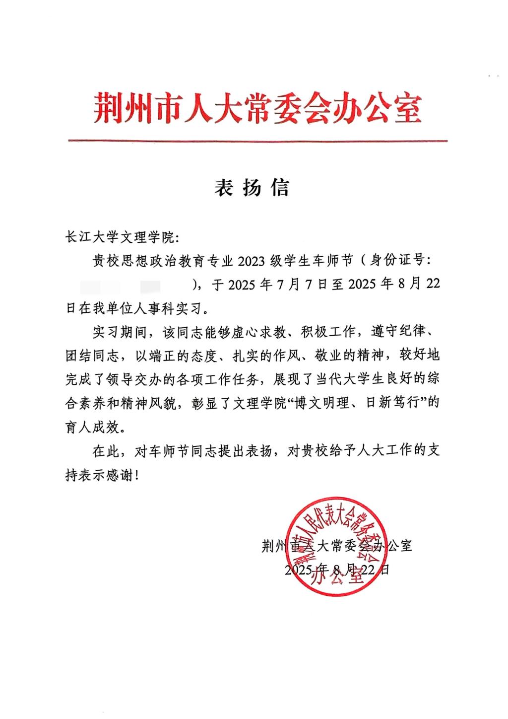 据了解,车师节于2025年7月7日至8月22日在荆州市人大常委会办公室人事科实习。实习期间,车师节始终保持虚心求教的态度,积极投入工作,严格遵守单位纪律,与同事相处融洽、团结协作。她以端正的态度、扎实的作风和敬业的精神,高质量完成了领导交办的各项工作任务,充分展现出当代大学生良好的综合素养和精神风貌。