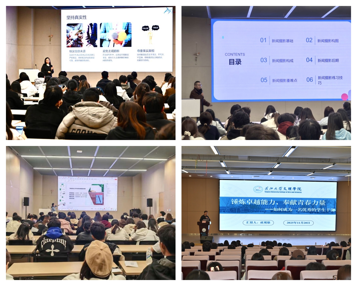 训练营启动仪式于10月21日在图书馆103报告厅举行,党委学生工作部部长李刚英,副部长冉继强、张曦、王琳、黄婷婷及学生组织指导老师共同出席。技能培训阶段,各领域教师结合实践需求开展专业授课:党委宣传部部长周芳聚焦高校宣传工作实际,系统讲解校园新闻写作核心技巧;人文与传媒学院王磊老师从新闻摄影的定义、特征与方法入手,分享摄影心得及实战经验;党委学生工作部关明明老师采用“理论+实操+案例”模式,详细讲解公众号排版与编辑要点;建筑与设计学院党总支副书记成观雄则从角色认知、核心素养、能力提升、工作艺术、成长展望五个维度,深入剖析优秀学生干部应具备的品质,全方位为学生干部补足能力短板。